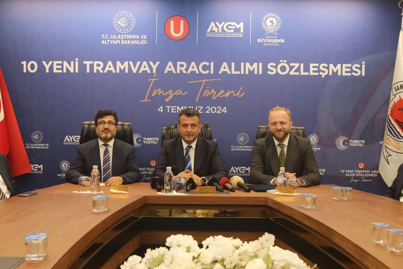 Мэр Самсуна Халит Доган, генеральный директор по инвестициям в инфраструктуру Министерства транспорта и инфраструктуры д-р Ялчин Эйигюн и заместитель председателя совета директоров компании Bozankaya Эмрах Дал объявили о начале поставок новых трамваев, произведенных турецкой компанией Bozankaya.