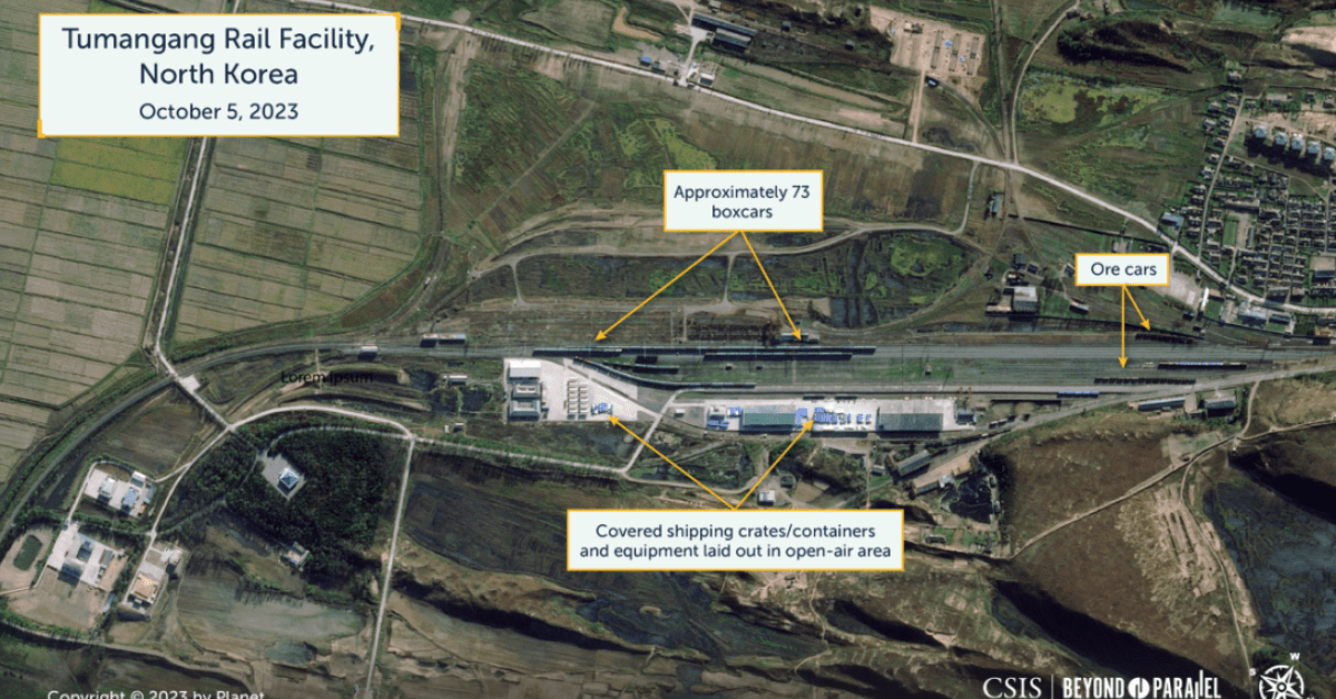 Эксперты отмечают, что на снимках, полученных спутником в четверг, было подсчитано большое количество грузовых вагонов (более 70) на железнодорожной станции Туманганг в городе Расон на границе Северной Кореи и России.