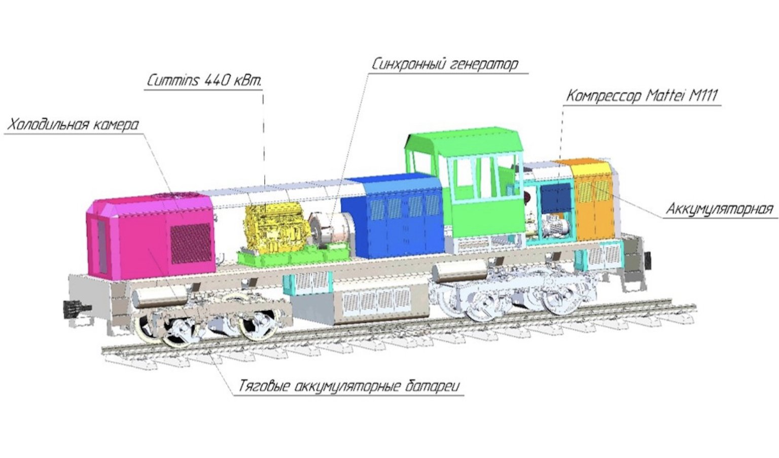 - Type of electrical transmission: variable-frequency AC (traction generator – synchronous AC, traction motors – asynchronous with a short-circuited rotor (4 pcs)).