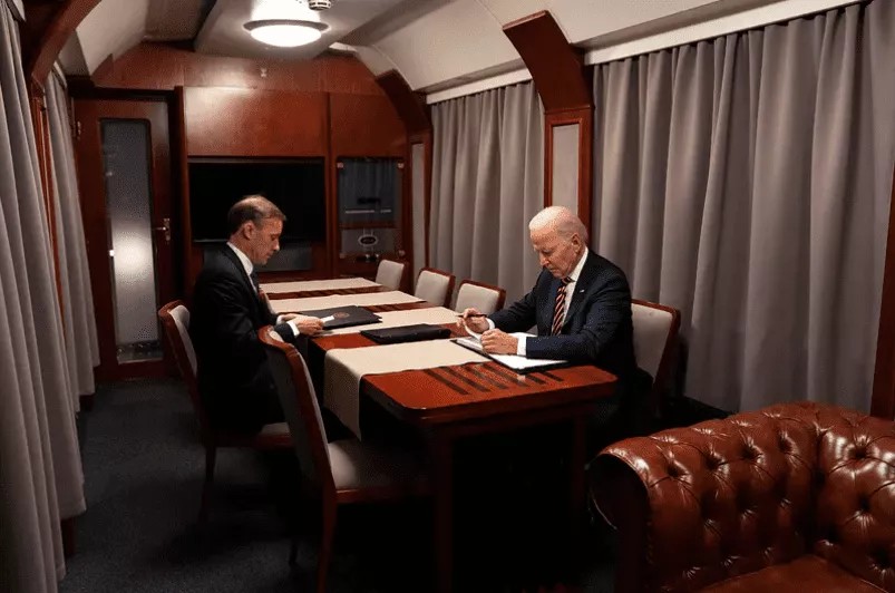 У понеділок, 20 лютого, Президент США зустрівся у Києві з Президентом України Володимиром Зеленським. Цей візит тримався в секреті до кінця. У поїзд УЗ Байден взяв лише двох журналістів — Сабріну Сіддікі з The Wall Street Journal та фотографа AP Евана Вуччі. Телефони обох були конфісковані та повернуті у посольстві США у Києві.