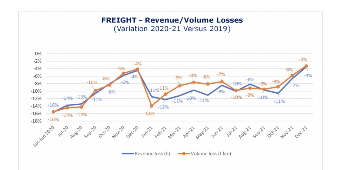 З початку пандемії до вересня 2021 року керуючі інфраструктурою повинні були зафіксувати приблизно 10% зниження доходів від стягнення плати за доступ до залізничної інфраструктури.