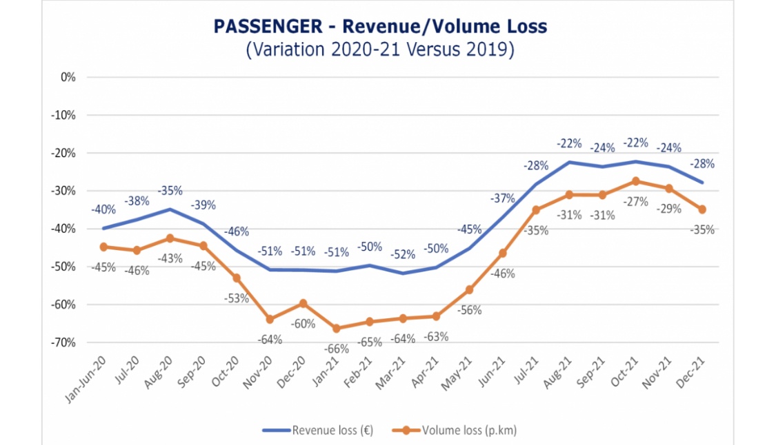 Найгірша ситуація в пасажирських перевезеннях – з листопада 2020 року до квітня 2021 року, за даними CER, тоді європейські перевізники в сумі генерували на 50% менше виручки, а також було зафіксовано значне падіння кількості пасажирів.
