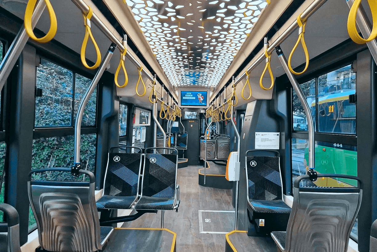 Цей трамвай, довжиною менше 15 метрів, оснащений системою інформаційного забезпечення для пасажирів, USB-розетками і поручнями, що підігріваються.